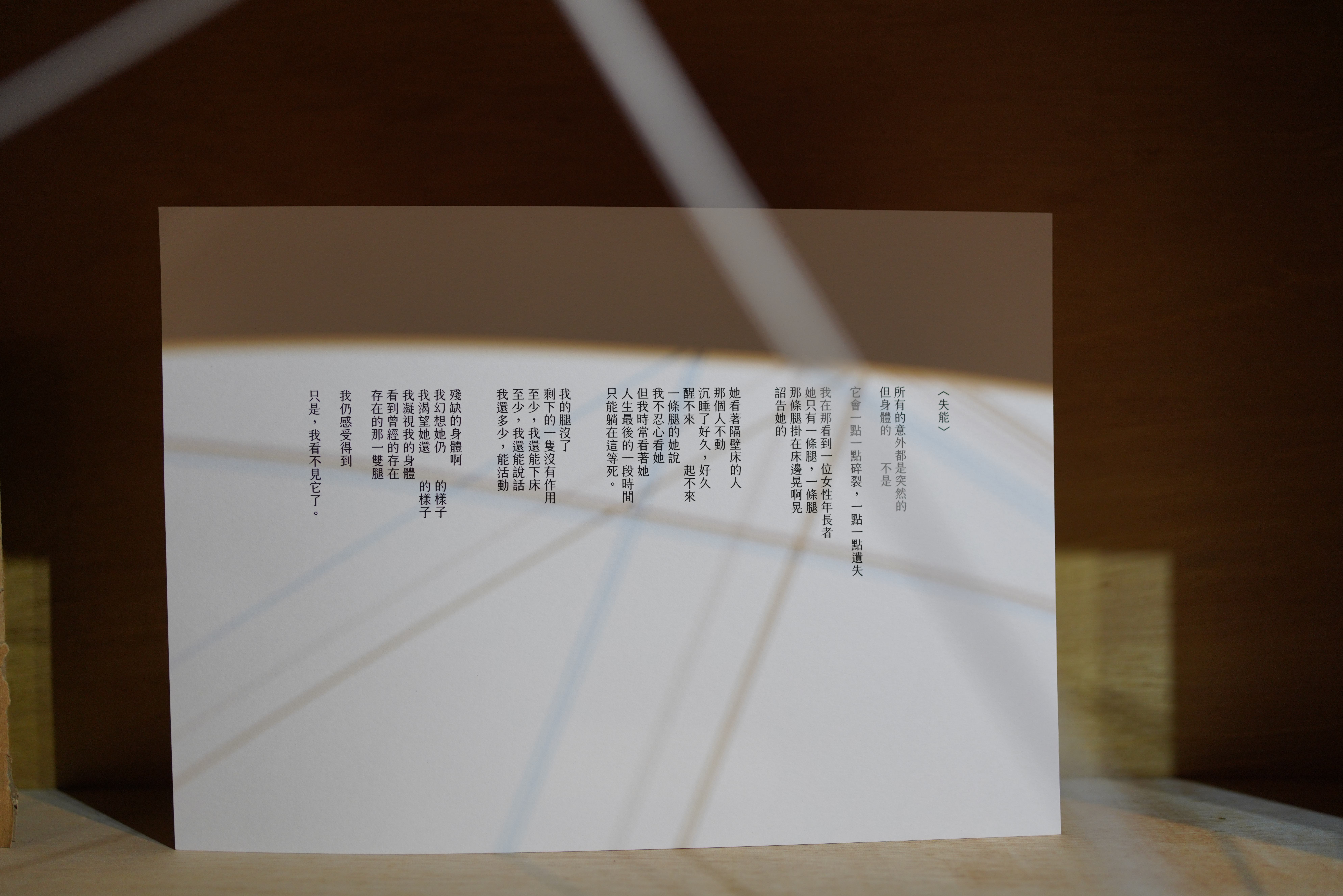 創作源於在長照機構對臥床住民與失能者的觀察與陪伴,參與他們日常的我時常感到無所適從,因而想把這種身不由己或受制於人的狀態表現出來。